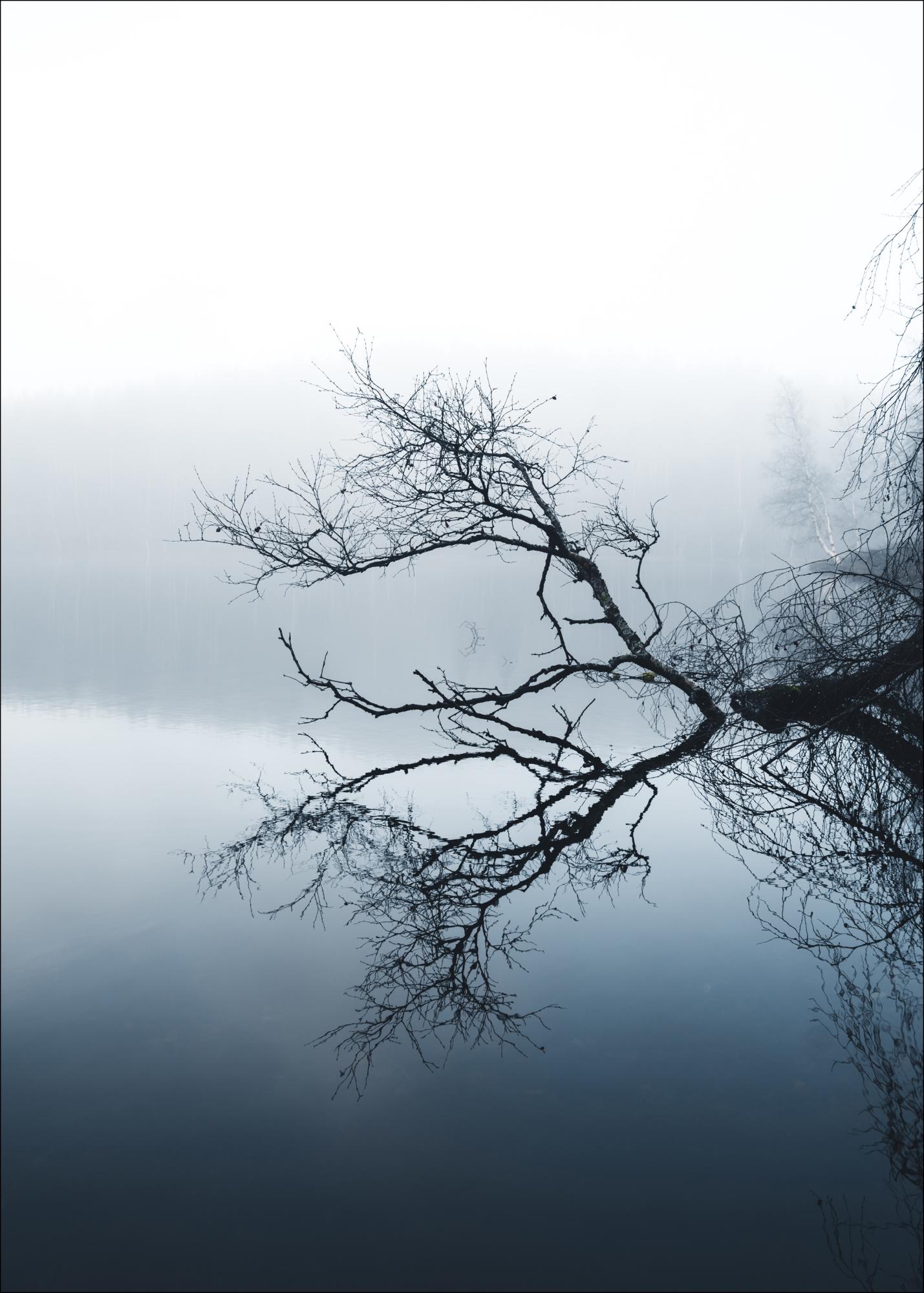 Un poster alb cu un lac larg și liniștit cu un copac mort care se ridică din apă. Când creanga se curbează în sus, își aruncă reflecția pe lac și creează o imagine de oglindă uimitoare. Cerul alb de deasupra ajută la distingerea între creanga reală și reflecția sa. Tonurile albastre oferă o senzație mai rece unui perete cald.