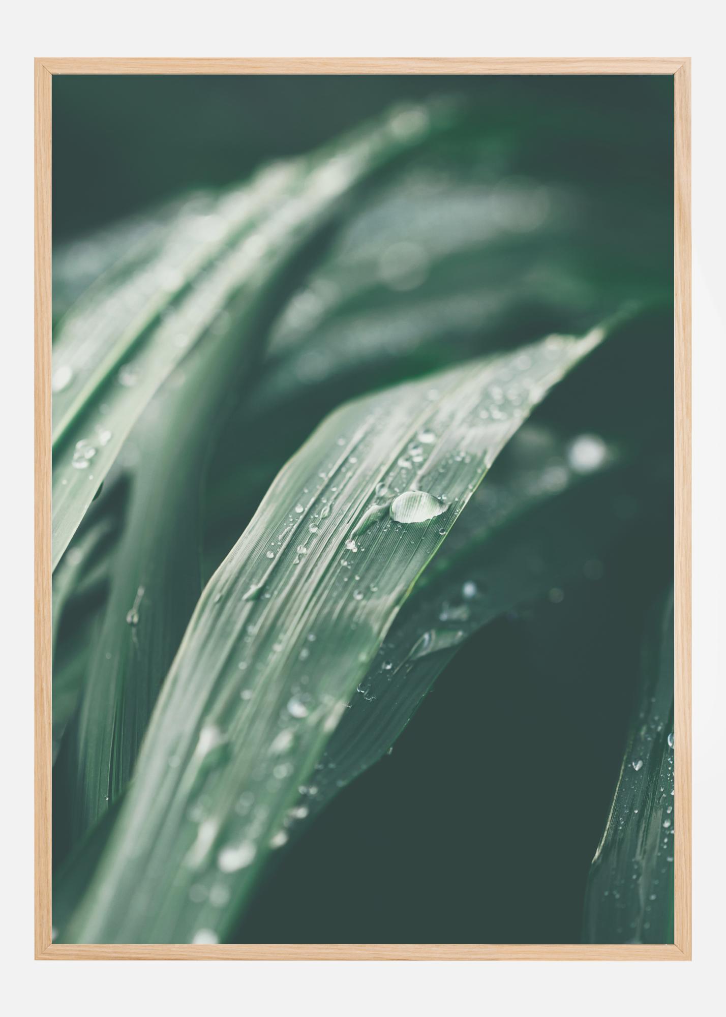 Un poster macro cu frunze și picături de apă. Frunzele verde-închis umplu imaginea cu venele lor în detalii clare. Picăturile de apă urmează curburile frunzelor și se preling spre marginile imaginii. Agățați acest poster pe un perete de culoare pământie moale pentru o senzație de pădure.