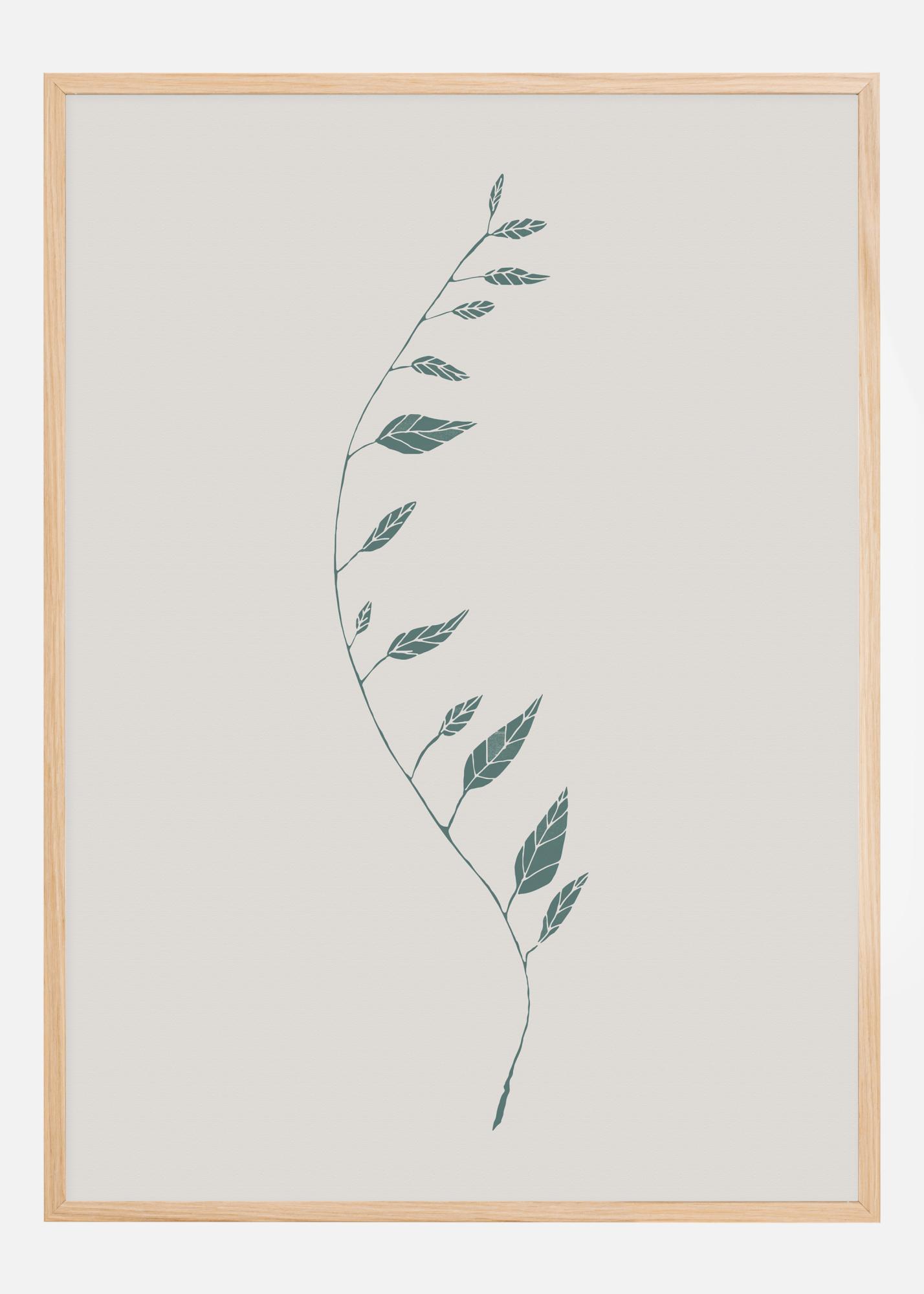 Un poster minimalist cu o ramură lungă verde care se leagănă ușor pe un fundal alb. Linia subțire a ramurii se ondulează delicat, toate frunzele se află pe aceeași parte ca și cum ar sufla un vânt care le împinge. Simplitatea sa oferă o senzație de calm, perfectă pentru o atmosferă relaxantă de baie.