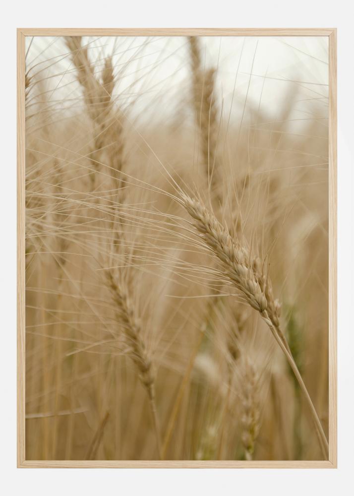 Un poster cu un prim-plan al unui câmp de grâu. Boabele de grâu sunt detaliate în prim-plan și au o culoare aurie fantastică. Sunt orientate spre distanță și arată cât de mare este câmpul de grâu de fapt. Deasupra se află un cer palid. Aduceți natura în casa dumneavoastră cu această imagine simplă.