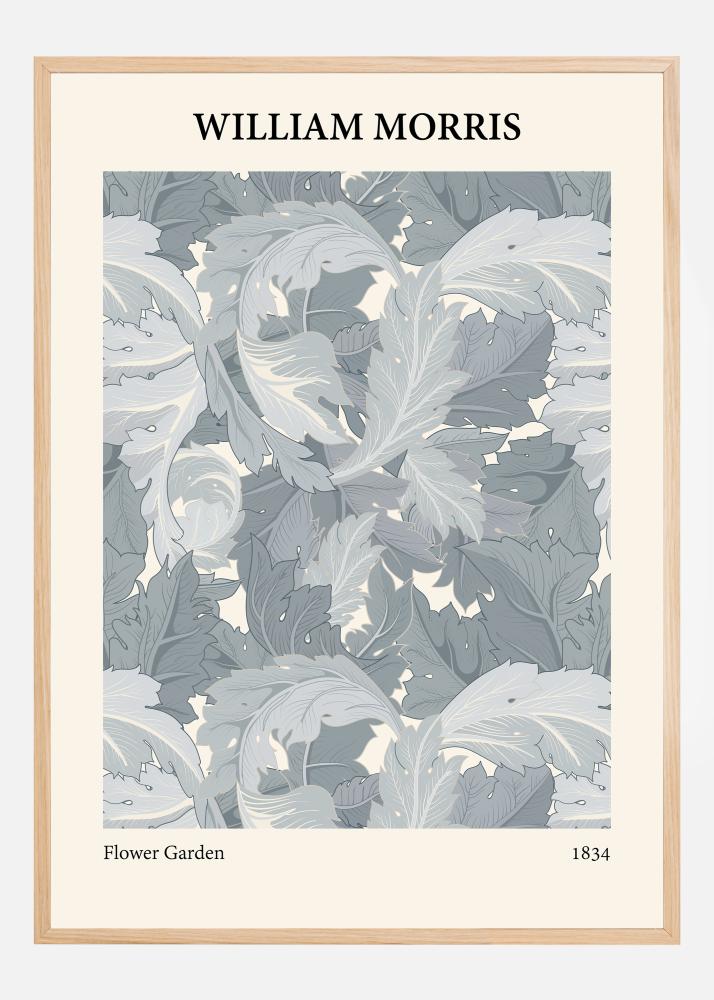 Afișul acesta cu motivul său luxuriant și sofisticat William Morris oferă o senzație de liniște și eleganță clasică. Designul este un omagiu adus vegetației abundente adesea asociate cu Morris și munca lui în cadrul mișcării Arts and Crafts. Motivul, numit "Grădina de Flori", conține o compoziție densă de frunze și flori, realizate în tonuri reci de albastru și gri, cu accente de alb crem. Fiecare detaliu al acestui afiș este gândit cu grijă, creând o senzație de grădină virtuoasă și ordonată.