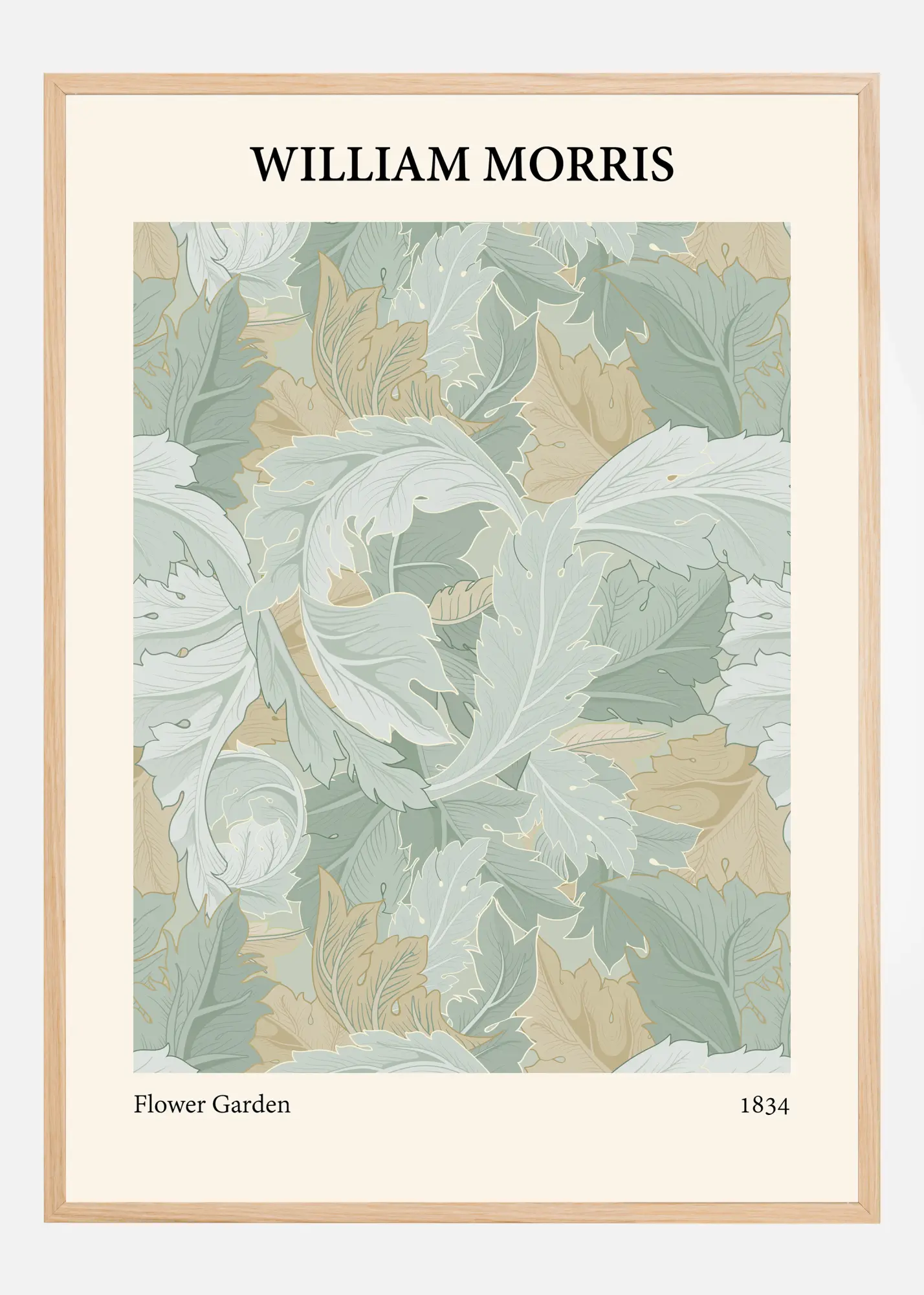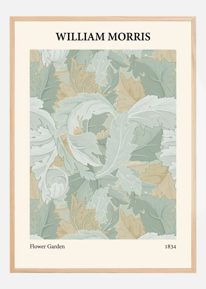 Această poster elegantă și captivantă este un omagiu adus lui William Morris și contribuțiilor sale de neuitat în design și artă. Cu motivul său „Flower Garden”, această imprimare prezintă o compoziție sofisticată de frunze și forme florale care se împletesc într-o paletă de culori de tonuri liniștitoare albastru-verzui și bej cald. Fiecare element este proiectat cu bogăția de detalii caracteristică lui Morris, creând un sentiment de profunzime și complexitate care poate fi apreciat cu fiecare privire.