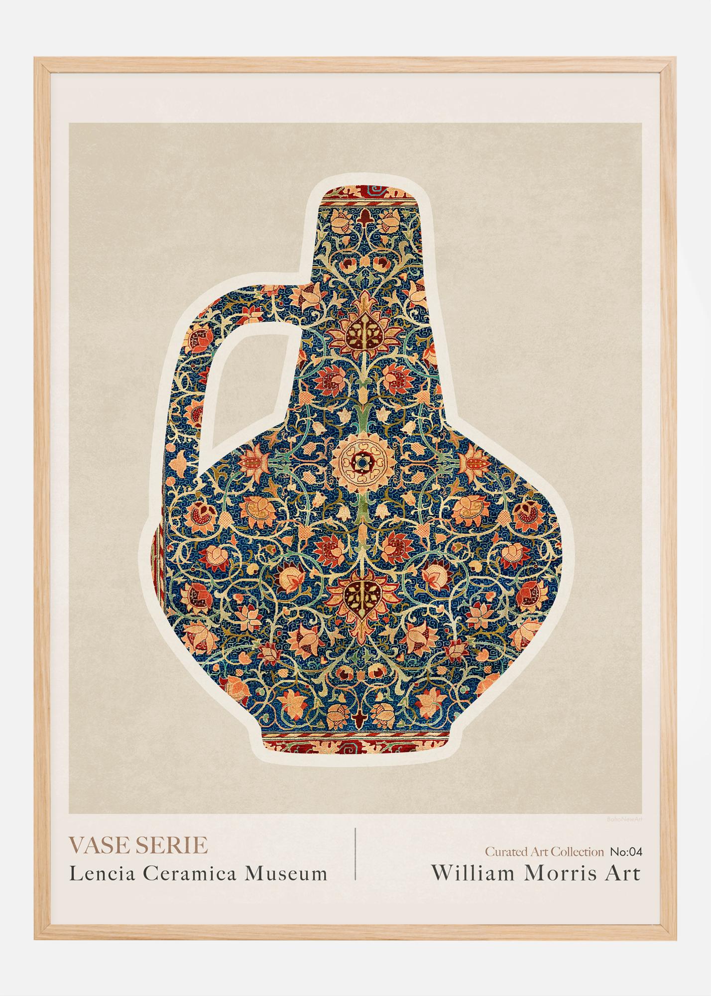 Acest poster, care este numărul 04 din "Curated Art Collection" de la Lencia Ceramica Museum, este un omagiu bogat și complex adus lui William Morris și contribuția sa semnificativă la arta modelelor. Aici este prezentată o vază elegantă, acoperită cu un model detaliat și colorat care emană fascinația epocii victoriene pentru arta orientală și medievală, un stil pe care Morris l-a ajutat să-l popularizeze.