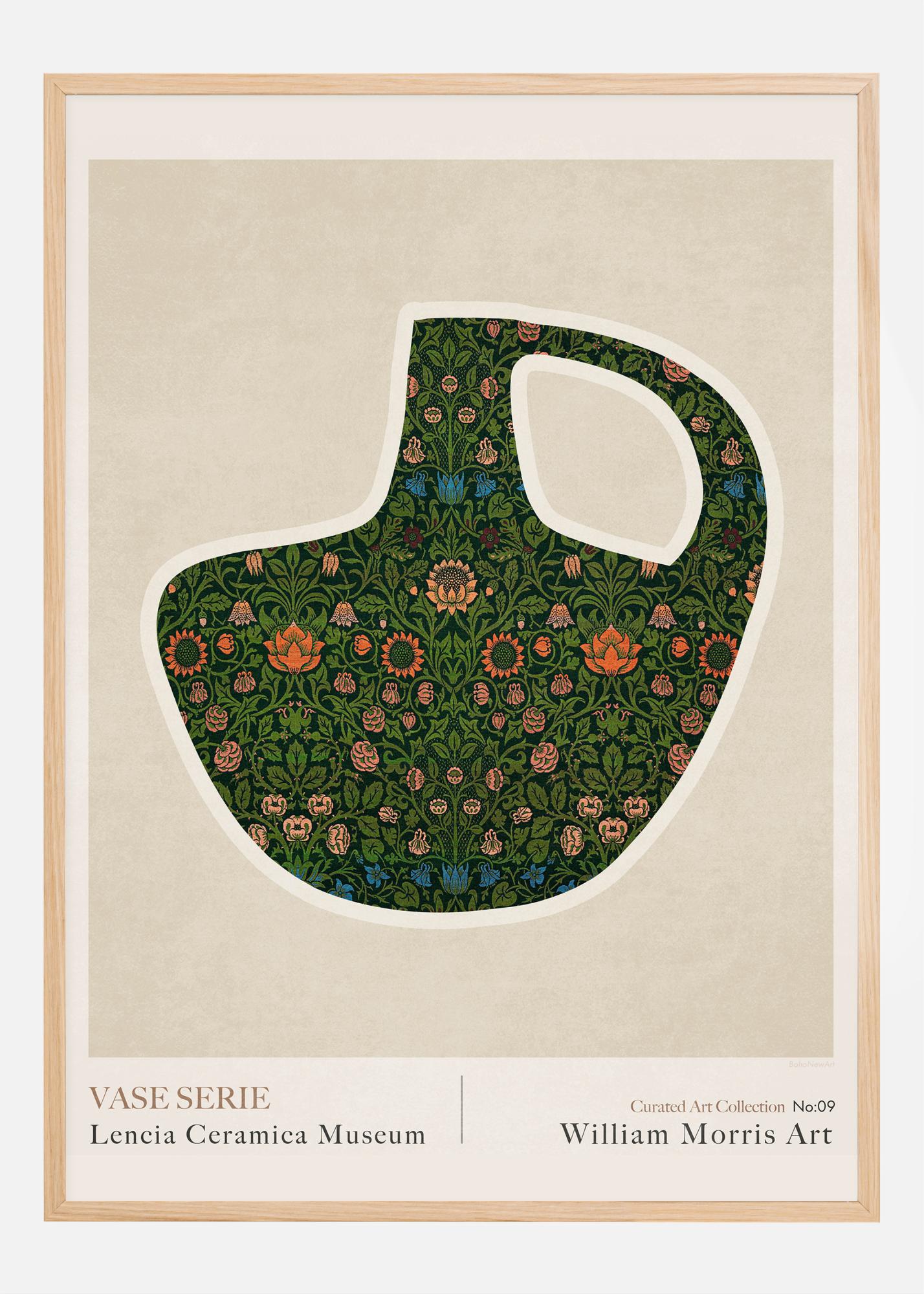 Coloristica posterului este profundă și caldă, cu nuanțe de verde, portocaliu și roz care formează o paletă bogată și complexă. Această compoziție sofisticată de culori arată frumos pe fundalul neutru și devine remarcabilă într-o ramă simplă și curată din lemn (neinclusă în motiv). Ca numărul 09 în seria de vaze a Muzeului Lencia Ceramica, acest afiș este un omagiu adus talentului artistic al lui William Morris și oferă o decorație elegantă și istoric conectată pentru toți cei care apreciază măreția designului și frumusețea motivelor naturale.