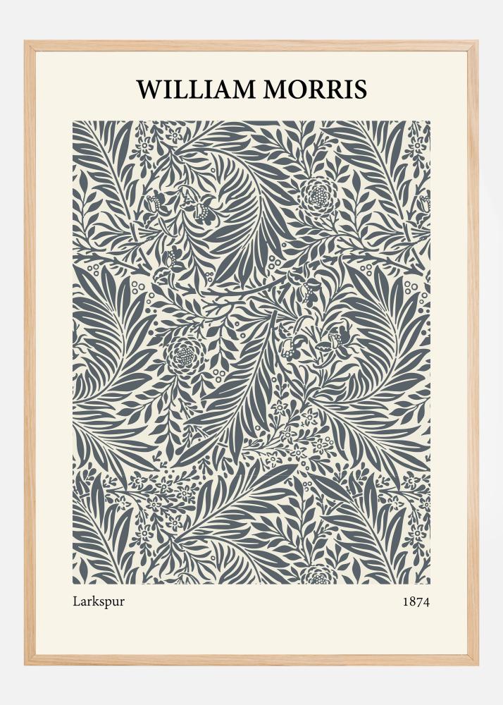 Afișul William Morris din 1874, intitulat "Larkspur", evidențiază bogăția detaliilor și frumusețea organică caracteristică designului lui Morris. Motivul, care înflorește cu flori și frunziș complexe, emană o eleganță atemporală care completează atât spațiile tradiționale, cât și cele contemporane. Designul este o reprezentare clasică a valorilor mișcării Arts and Crafts, unde calitatea lucrului manual și temele apropiate de natură sunt în centrul atenției.