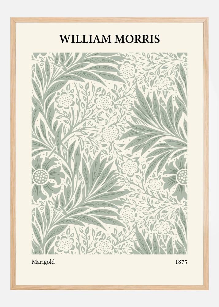 Această afișă distinctivă prezintă designul "Marigold" al lui William Morris din anul 1875, care ilustrează o bogăție de motive inspirate din natură, toate realizate cu o abilitate inconfundabilă și un simț al detaliului. Paleta de culori verde, vibrantă dar totuși subtilă, este tipică pentru designul lui Morris și dă viață fiecărei frunze și petale, transformând opera de artă într-o clasică piesă de decor atemporală.