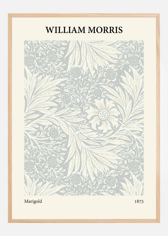 Afișul acesta este o interpretare elegantă a modelului clasic "Marigold" al lui William Morris din 1875, redat într-o paletă de culori blânde și liniștitoare. Designul este o simfonie de flori și frunzișuri complicate, împletite împreună, creând o senzație a unei grădini englezești în repaus. Dragostea lui Morris pentru natură și meșteșug strălucește în fiecare detaliu al acestei compoziții complexe.
