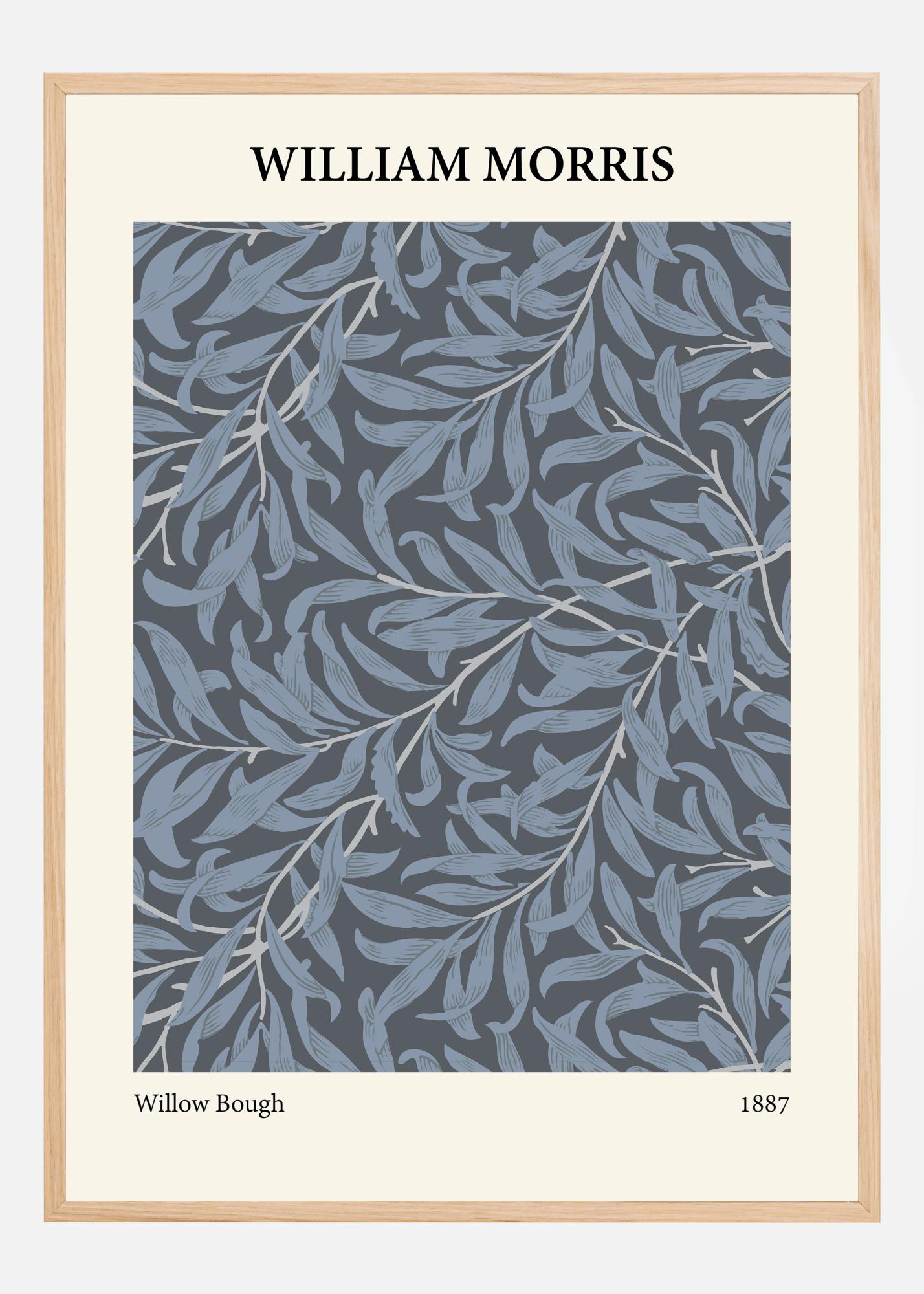 Afișul acesta este o reprezentare frumoasă a designului lui William Morris "Willow Bough" din 1887, care redă forma grațioasă a frunzelor de salcie într-o paletă sofisticată de nuanțe de albastru-gri. Acest model este un exemplu excelent al capacității lui Morris de a combina estetica cu motivele naturii, creând o impresie liniștitoare și primitoare care se potrivește în multe stiluri de interior diferite.