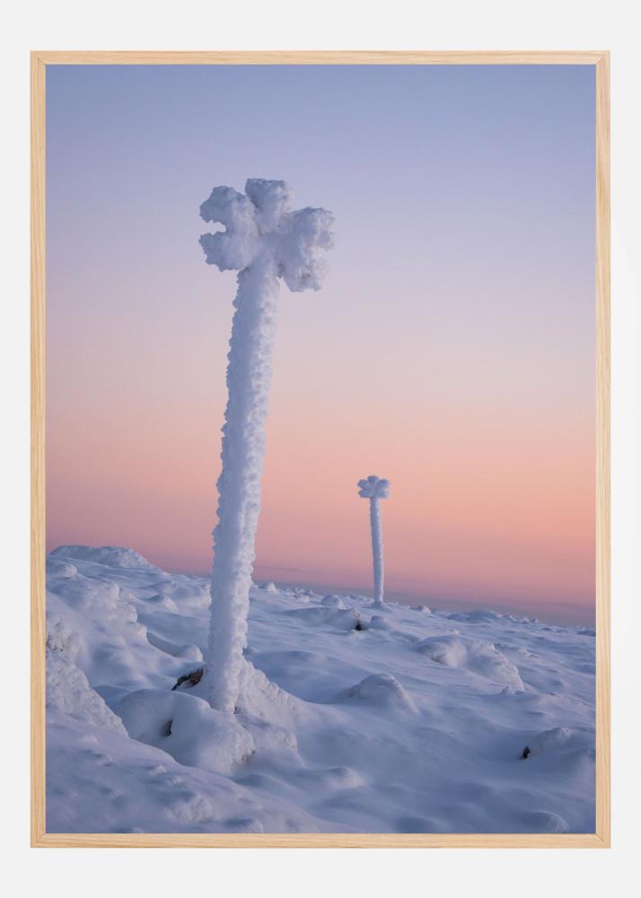 Această posteră prezintă un peisaj de iarnă de vis, unde formațiuni acoperite de zăpadă se ridică dintr-un câmp alb, ondulat și moale. Motivul transmite liniște și minimalism, cu stâlpi îmbrăcați în brumă ce seamănă aproape cu sculpturi naturale. Cerul are o trecere frumoasă de culori, oferind imaginii o expresie calmă și poetică – perfectă ca print sau afiș pentru cei care doresc să creeze o atmosferă armonioasă și modernă acasă.