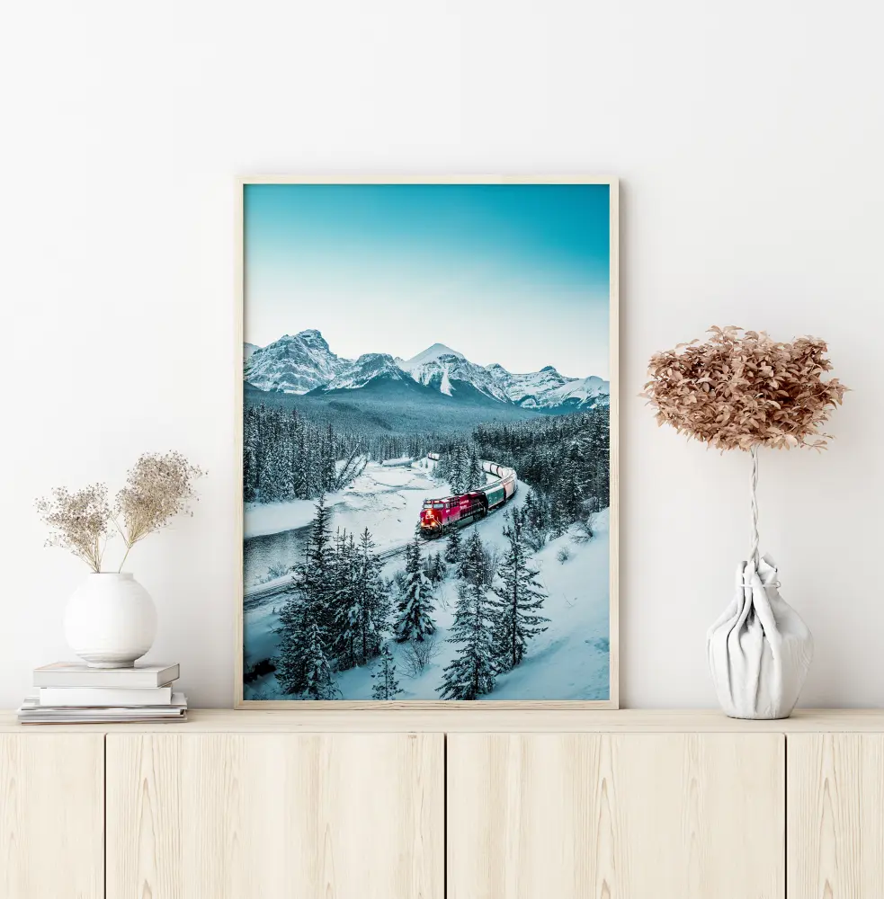 Un poster luminos cu un tren roșu care șuieră printr-un peisaj înzăpezit. Urmărește calea trenului în timp ce taie printr-un pas de munte. Munți albaștri acoperiți de zăpadă pot fi văzuți în depărtare. Cerul luminos, albastru deschis subliniază doar senzația de iarnă care plutește în aer. Adu-l acasă dacă dorești acea senzație festivă.