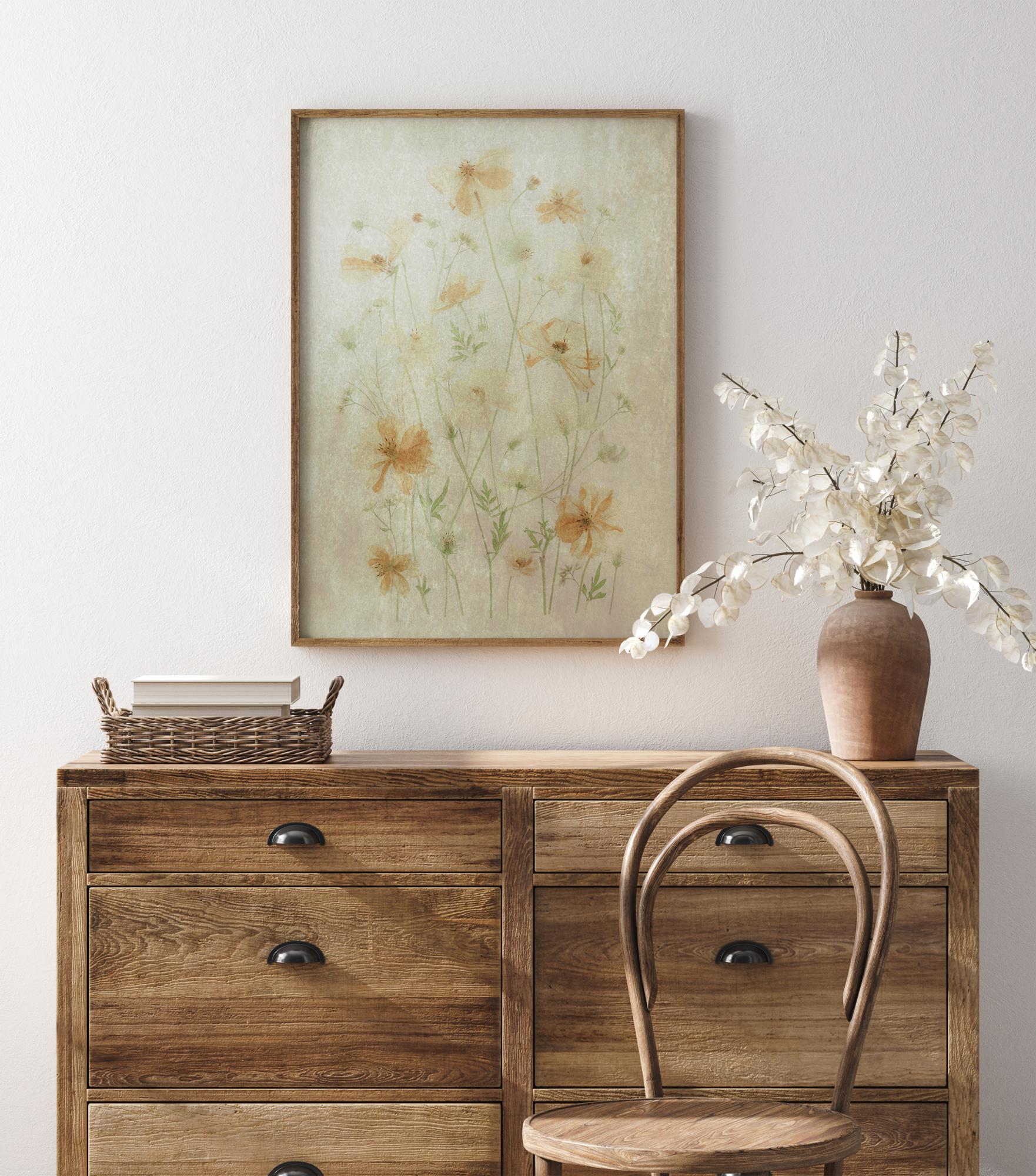 Un poster elegant cu flori portocalii moi și frunze verzi pe un fundal alb. Efectul de acuarelă face ca fiecare dintre aceste plante să pară moale și delicată. Totuși, există detalii fantastice în fiecare dintre acestea în această imagine florală moale. Transformă-ți casa într-o grădină a Edenului când aduci acasă acest imprimeu floral.