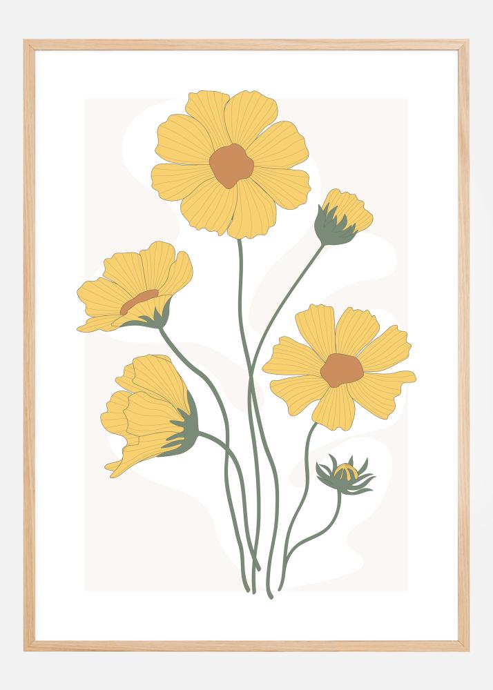 Un poster luminos cu gălbenele galbene creat într-un stil amuzant de imprimare. Fiecare dintre flori strălucește pe fundalul alb. Deși este un design simplu stilizat, florile sunt vesele și reprezintă modalitatea perfectă de a te trezi cu un zâmbet pe buze.