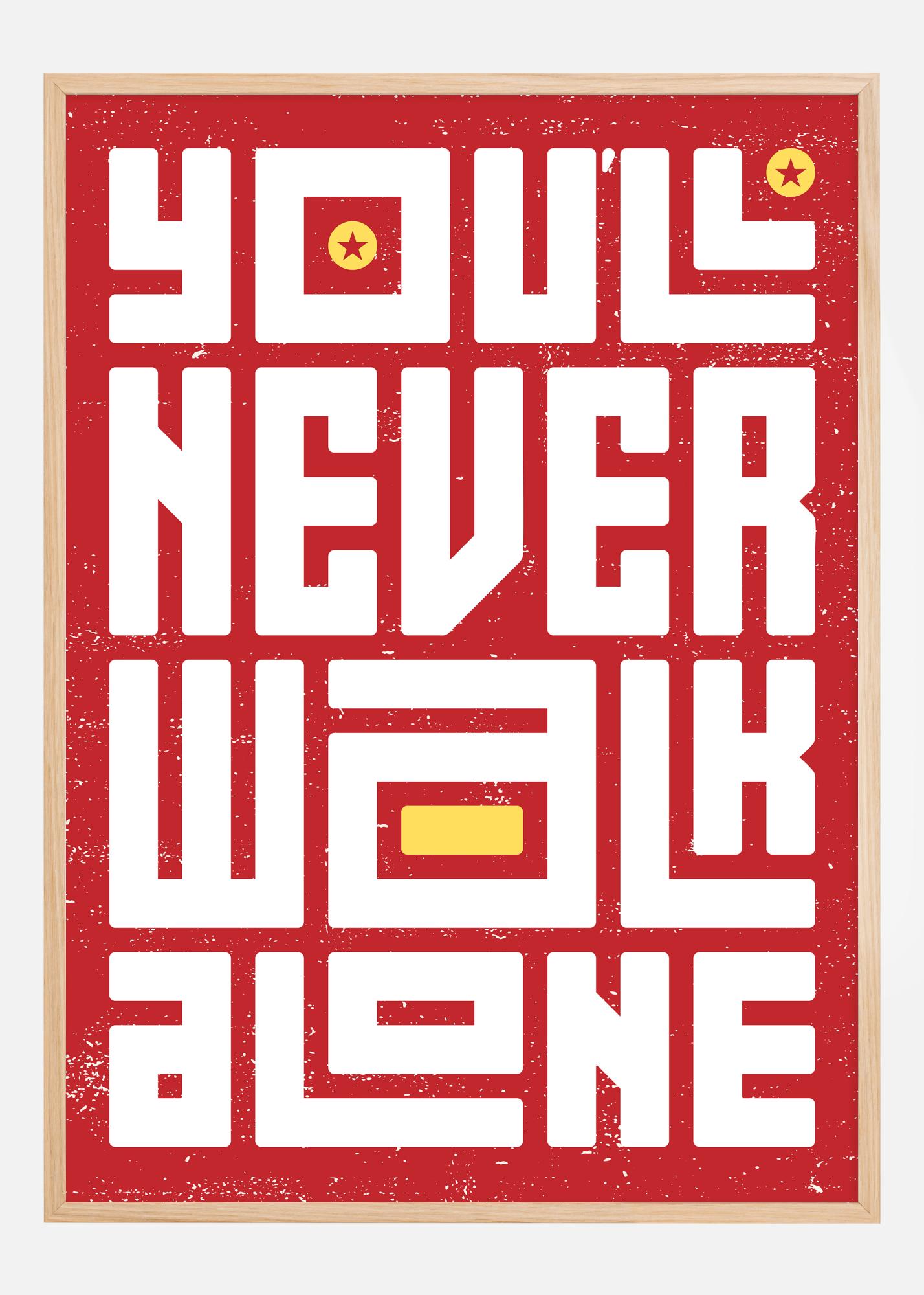 Această poster energică și revigorantă emană o prezență puternică cu tipografia sa îndrăzneață, blocată, care evidențiază mesajul "You'll Never Walk Alone" în litere albe strălucitoare pe un fundal roșu puternic. Literele mari sunt aranjate cu grijă pentru a maximiza efectul lor vizual și sunt decorate cu stele aurii și cu o formă dreptunghiulară care rupe blocul de text, adăugând o dimensiune suplimentară designului.