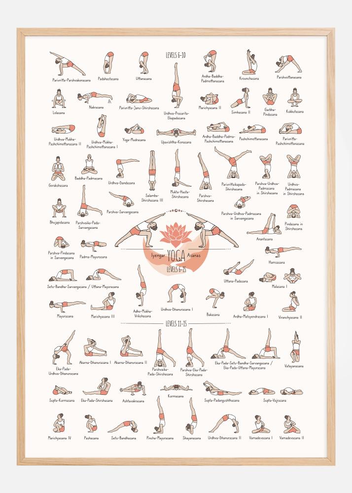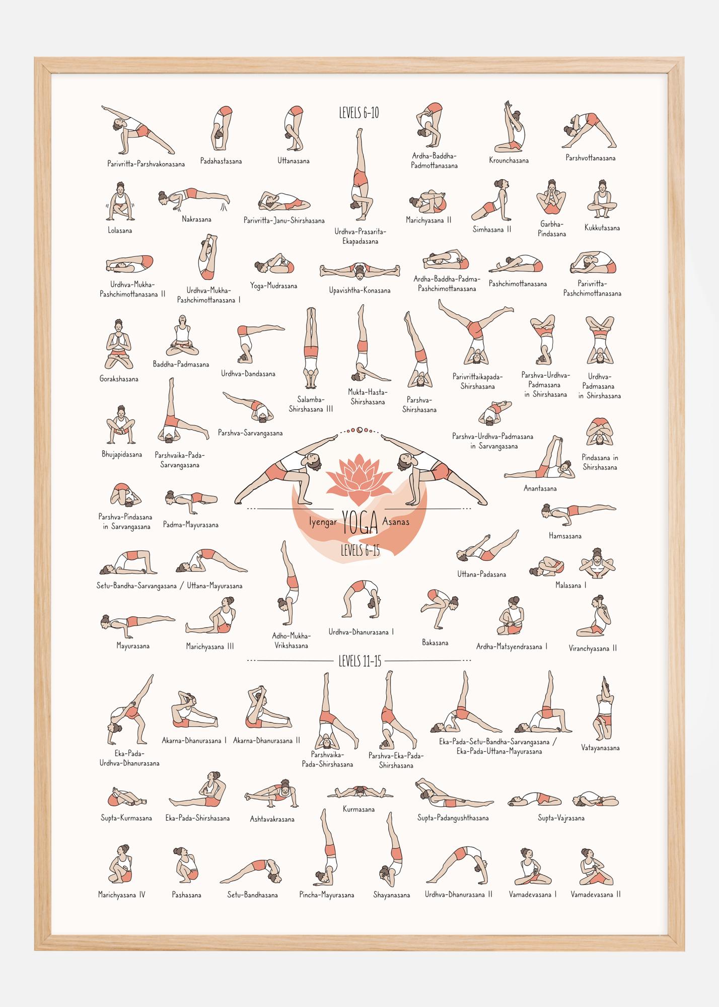 Această planșă detaliată și plină de culoare ilustrează o colecție cuprinzătoare de asane Iyengar Yoga de la nivelul 6 la 15. Fiecare poziție de yoga este fin ilustrată cu culori calde și plăcute care evidențiază fiecare formă și gest, în timp ce numele ușor de identificat lângă fiecare ilustrație facilitează urmărirea și practicarea. Designul este atât funcțional, cât și estetic, creând o atmosferă primitoare pentru practicanții de yoga de toate nivelurile de cunoștințe.