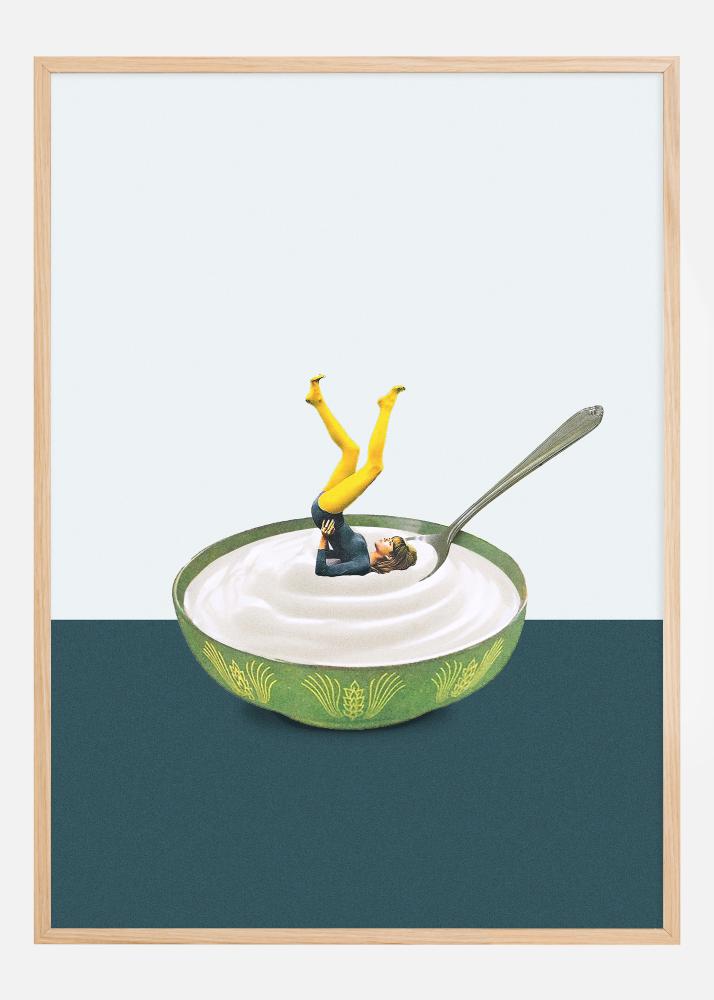 Acest poster unic și jucăuș prezintă o imagine umoristică a unei persoane care execută o postură de yoga scufundată într-un bol cu iaurt, complet cu o pereche de pantaloni galben jucăuș care se potrivesc cu poziția inversată. Imaginea creativă combină elemente de suprarealism și umor cotidian și este o abatere revigorantă de la arta și decorațiunile tradiționale. Fundalul în două tonuri contribuie la evidențierea compoziției neobișnuite și o face să fie un inițiator de conversație.