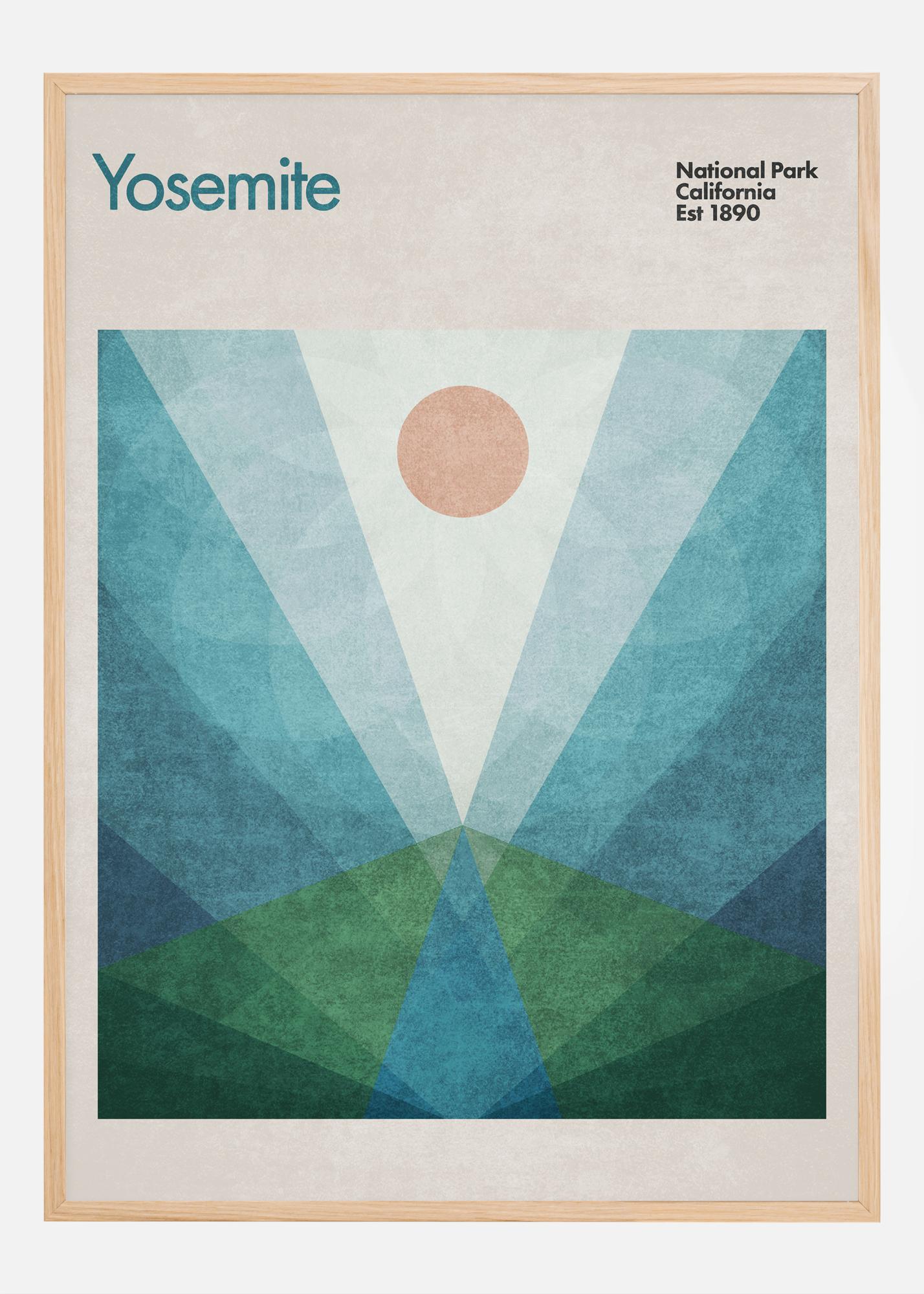 Acest poster surprinde spiritul Parcului Național Yosemite cu un design geometric care reflectă peisajele mărețe și iconice ale parcului. Cu o paletă de culori care amintește de ceruri limpezi și văi luxuriante, textul "Yosemite National Park California Est 1890" aduce un omagiu istoriei îndelungate a parcului ca parc național și comoară naturală.