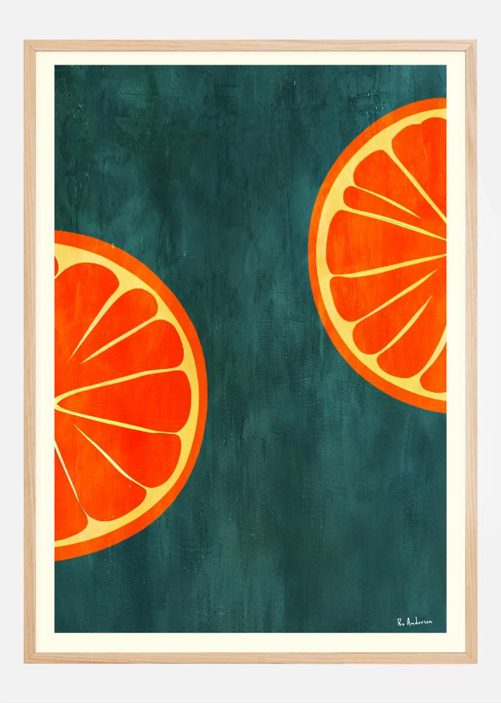 Acest poster luminos și revigorant prezintă două jumătăți de portocală pe un fundal verde închis, o imagine la fel de energizantă ca un pahar de suc proaspăt stors. Tonurile bogate și vibrante de portocaliu ale feliilor de portocală ies în evidență pe fundalul adânc, creând o imagine care este atât simplă cât și izbitoare. Este un design care celebrează simplitatea și frumusețea naturii, și nu ar putea fi mai perfect pentru a lumina o bucătărie sau o sufragerie cu o notă de culoare.