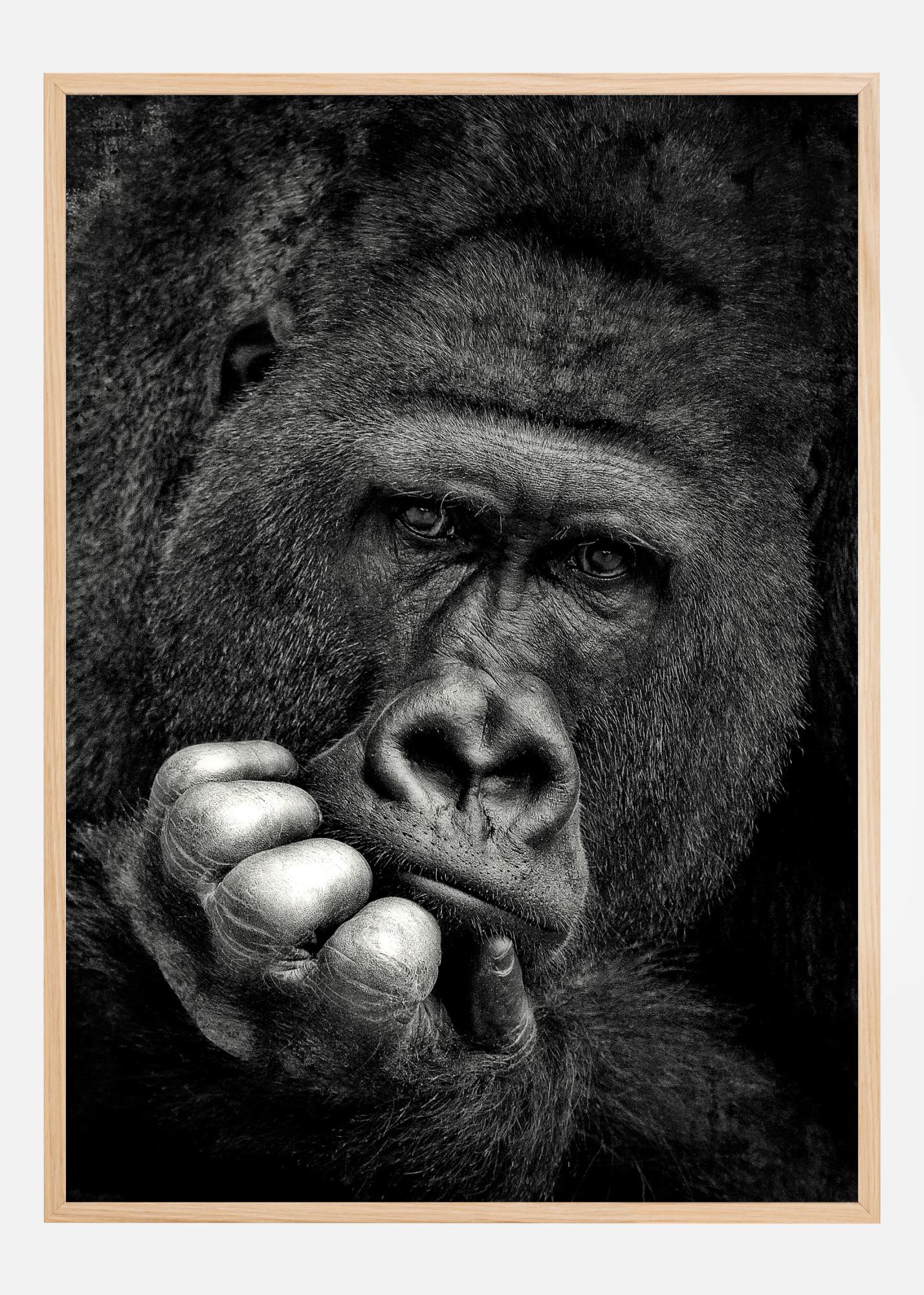 Un poster portret fantastic al unei gorile într-o poză contemplativă. Gorila privește cu o privire neclară către cameră. Una dintre mâini este îndoită sub bărbie, ca și cum ar medita la întrebări importante. Printul alb-negru evidențiază toate detaliile feței acestui primat complet incredibil.