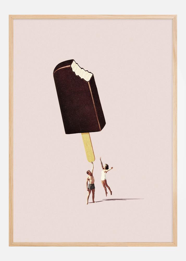 Acest poster fermecător prezintă o imagine unică și jucăușă a două persoane care par să fi găsit o înghețată gigantă pe băț! Cu o compoziție plină de imaginație și un fundal cald roz pastel, această imagine oferă o senzație de bucurie estivală și nostalgie. Figurinele vesele, îmbrăcate în costume de baie simple, se întind după înghețată, care are un aspect realist cu o mușcătură scoasă, creând un contrast încântător cu mediul minimalist. Această scenă creativă și vibrantă captează atenția privitorului și trezește amintiri ale zilelor însorite.