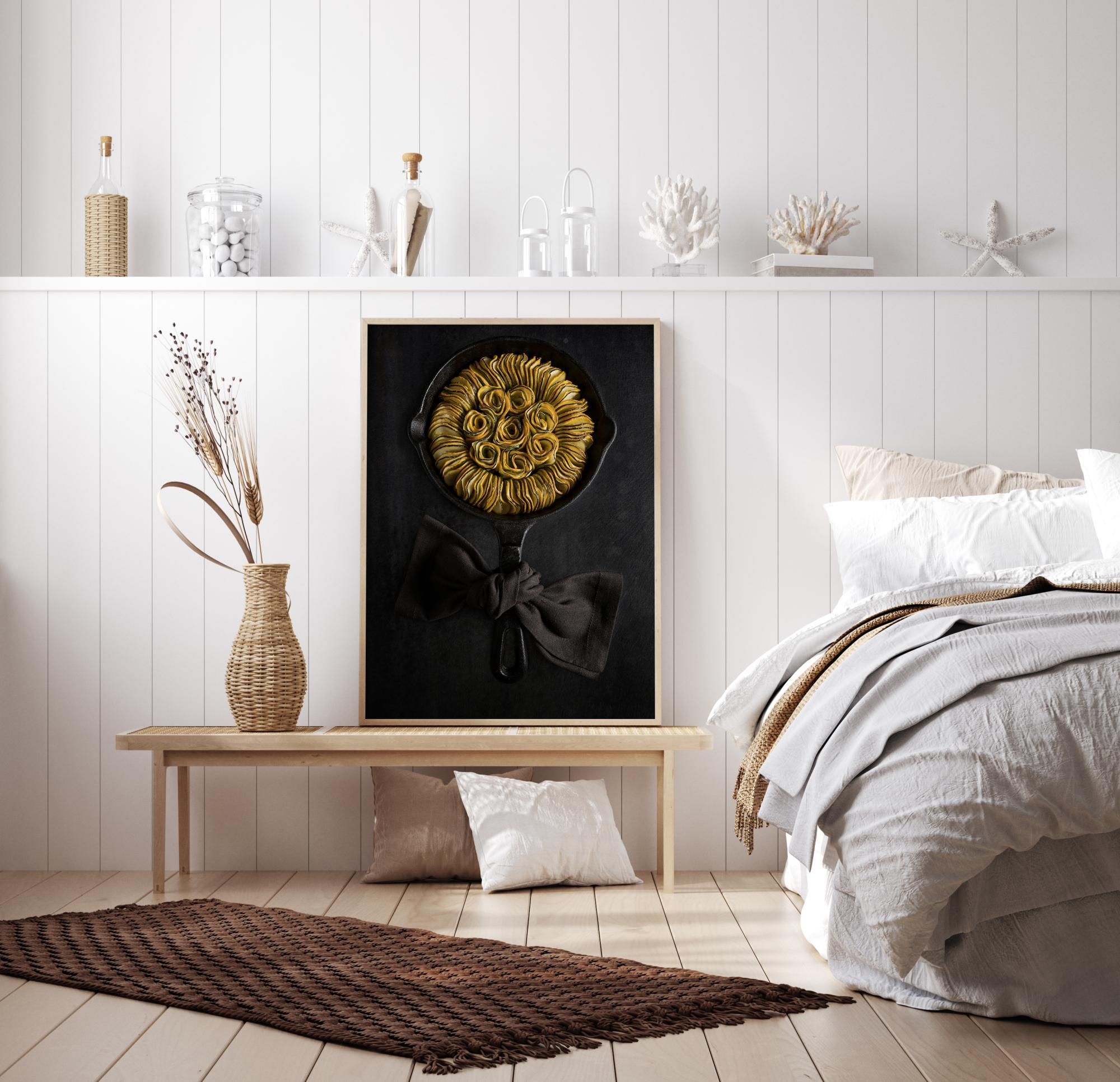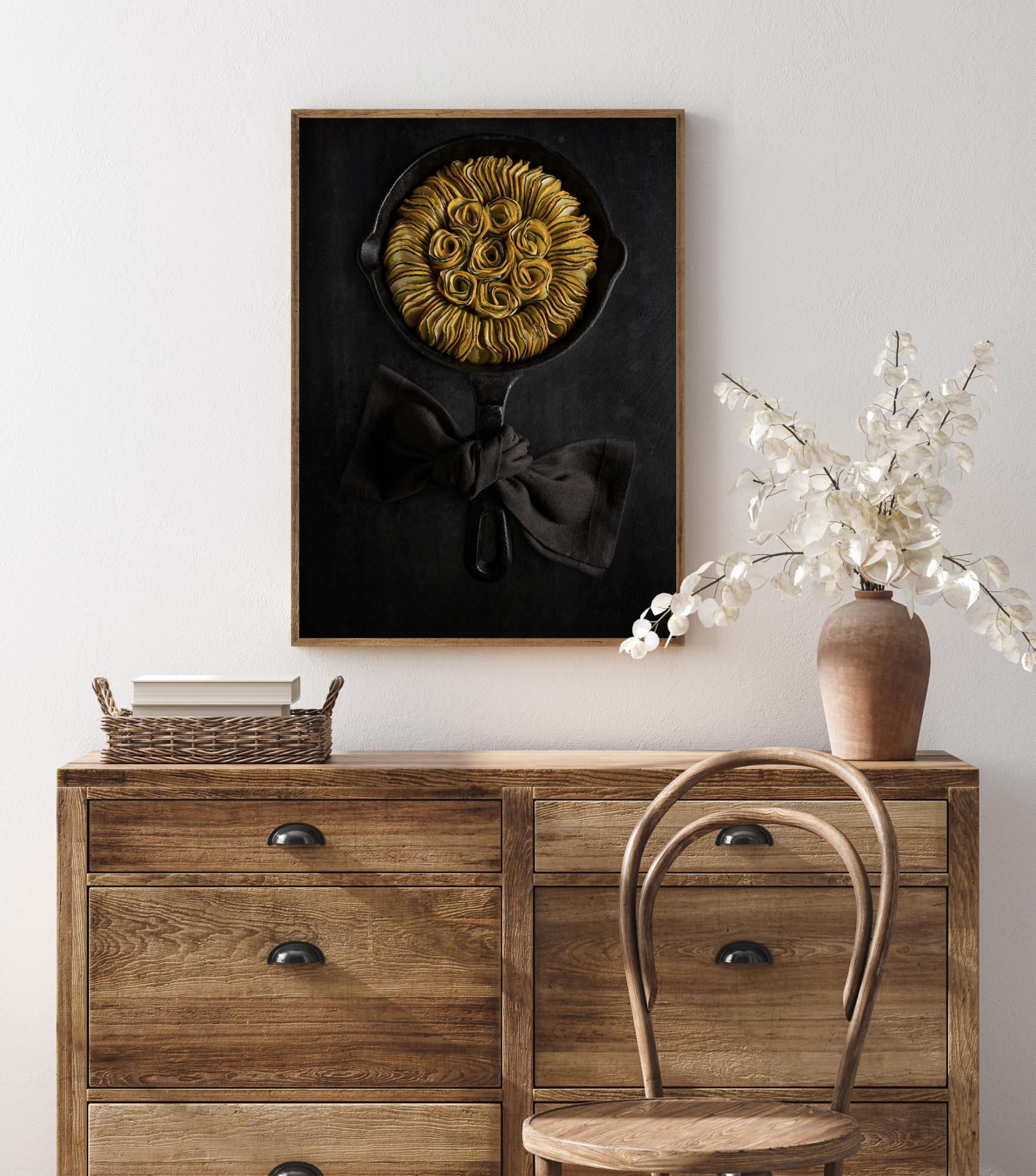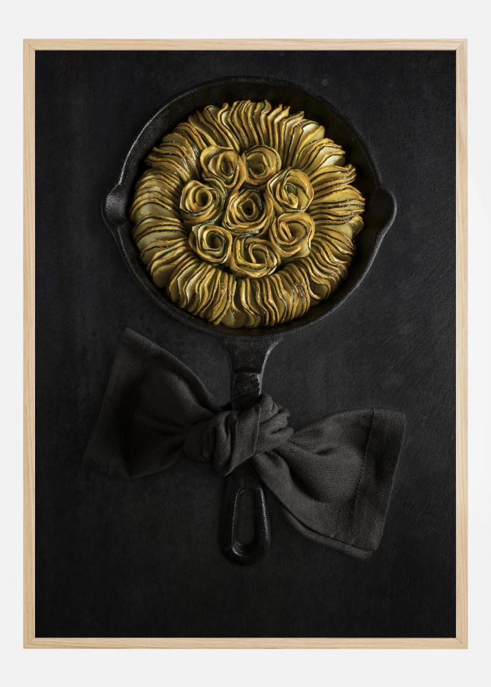 Un poster delicios cu o ratatouille cu dovlecei sau dovlecel aranjat elegant într-o tigaie de fontă, creând o formă uimitoare de floarea-soarelui. Dovleceii galbeni și verzi ies în evidență pe fundalul tigaii negre, cu o panglică de țesătură legată de mâner. Agățați-o în bucătăria dumneavoastră și vedeți dacă puteți pregăti acest fel de mâncare atrăgător.